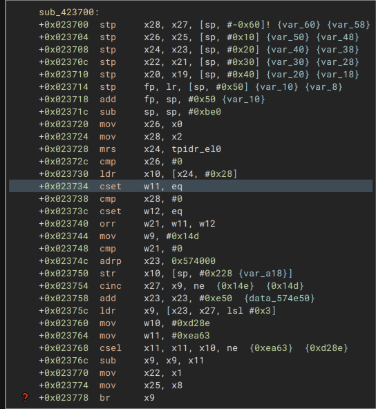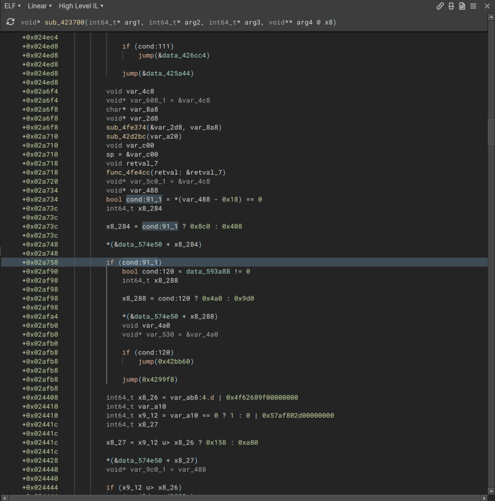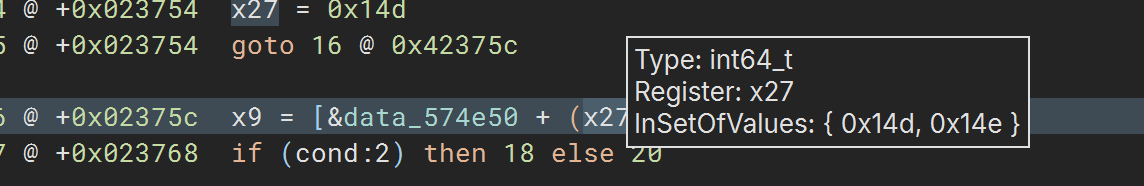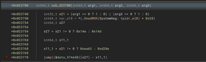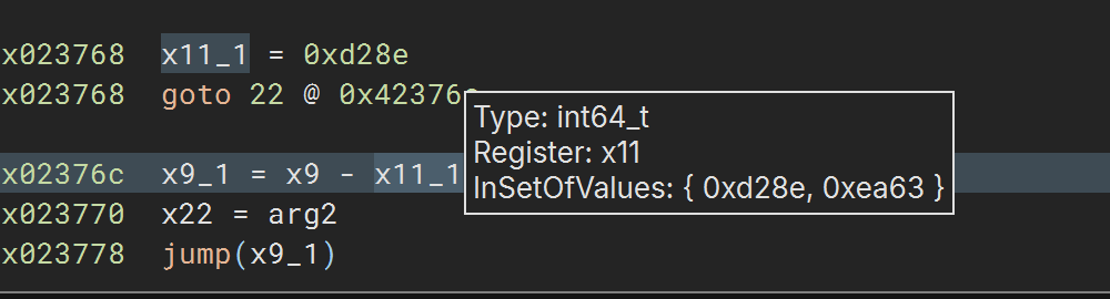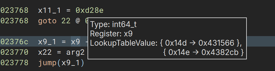 if isinstance(def_site,MediumLevelILSetVarSsa): if isinstance(def_site.src,MediumLevelILLoadSsa): tokens=list(def_site.src.traverse(lambda x: x)) table=def_site.get_possible_reg_values_after(def_site.dest.var.storage) if table.type!=RegisterValueType.LookupTableValue: raise RuntimeError("not lookup table {} {}".format(hex(def_site.address),def_site)) res={} for token in tokens: if isinstance(token,MediumLevelILVarSsa): mp=two_direct_indirect_jump_handler.search_var_value_ssa(token.var,mlil_ssa,cond) if mp==None: continue try: res|= {"t":table.mapping[mp["t"]],"f":table.mapping[mp["f"]]} except KeyError: try: res|= {"t":table.mapping[mp["t"]//8],"f":table.mapping[mp["f"]//8]} except KeyError: print(mp,token.var,table.mapping) print(hex(def_site.address),def_site) print("key error",mp,table.mapping) raise RuntimeError("maybe not two direct indirect jump {}".format(hex(def_site.address)))
