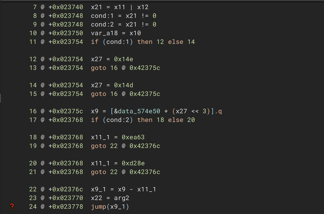 for _ in func.unresolved_indirect_branches: unsolved_addr=_[1] try: jump:MediumLevelILJump|MediumLevelILJumpTo=mlil[mlil.get_instruction_start(unsolved_addr)].ssa_form if not isinstance(jump,MediumLevelILJump) and not isinstance(jump,MediumLevelILJumpTo): raise RuntimeError("not jump {}".format(hex(jump.address))) var=jump.dest.ssa_form.var cond={"value":None} res=two_direct_indirect_jump_handler.search_var_value_ssa(var,mlil.ssa_form,cond) if res==None or cond["value"]==None: raise RuntimeError("calc fail {}".format(hex(jump.address))) if (isinstance(jump,(MediumLevelILJump)) or self.check_manual_update(func,unsolved_addr,res)): print(hex(unsolved_addr),jump,func.mlil.get_expr(cond["value"]),res) func.set_user_indirect_branches(unsolved_addr, [(func.arch,res["t"]),(func.arch,res["f"])],func.arch) self.resolved[unsolved_addr]=two_direct_indirect_jump_handler.resolved_data(cond=cond["value"],trueAddr=res["t"],falseAddr=res["f"]) except Exception as e: print(hex(unsolved_addr),e) continue def convert_jump_to_if(self,ctx:AnalysisContext): new_func=MediumLevelILFunction(ctx.function.arch,low_level_il=ctx.llil) old_mlil=ctx.function.mlil new_func.prepare_to_copy_function(old_mlil) for old_block in old_mlil: new_func.prepare_to_copy_block(old_block) for instr_idx in range(old_block.start,old_block.end): instr=old_mlil[instr_idx] if isinstance(instr,MediumLevelILJumpTo) and isinstance(instr.dest,MediumLevelILVar) and not instr.get_possible_reg_values(instr.dest.var.storage).type==RegisterValueType.ConstantValue: for tag in old_mlil.source_function.get_tags_at(instr.address,auto=True): old_mlil.source_function.remove_auto_address_tags_of_type(instr.address,tag.type.name) cond={"value":None} try: res=two_direct_indirect_jump_handler.search_var_value_ssa(instr.dest.ssa_form.var,old_mlil.ssa_form,cond) if res==None or cond["value"]==None or not self.check_addr_vaild(res["t"],ctx.function.view) or not self.check_addr_vaild(res["f"],ctx.function.view): old_mlil.source_function.add_tag("Bugs","need manual analyze jump",instr.address,auto=True) print("add bug tag at {}".format(hex(instr.address))) except Exception as e: old_mlil.source_function.add_tag("Bugs","need manual analyze jump",instr.address,auto=True) print("add bug tag at {}".format(hex(instr.address))) print(e) if isinstance(instr,MediumLevelILJumpTo) and instr.address in self.resolved: try: label_t=MediumLevelILLabel() label_f=MediumLevelILLabel() indirect_branches=ctx.function.get_indirect_branches_at(instr.address) if len(indirect_branches)!=2: raise RuntimeError("indirect branches len!=2 {} {}".format(hex(instr.address),indirect_branches)) for branch in indirect_branches: if branch.dest_addr==self.resolved[instr.address].trueAddr: label_t.operand=instr.targets[branch.dest_addr] if branch.dest_addr==self.resolved[instr.address].falseAddr: label_f.operand=instr.targets[branch.dest_addr] if_expr=new_func.if_expr(old_mlil.get_expr(self.resolved[instr.address].cond).copy_to(new_func), label_t,label_f,old_mlil[instr_idx].source_location) new_func.append(if_expr,old_mlil[instr_idx].source_location) except Exception as e: print(e) new_func.append(old_mlil[instr_idx].copy_to(new_func),old_mlil[instr_idx].source_location) else: new_func.append(old_mlil[instr_idx].copy_to(new_func),old_mlil[instr_idx].source_location) new_func.finalize() new_func.generate_ssa_form() ctx.mlil=new_func